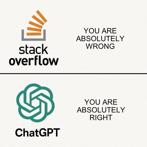 ☆ Yσɠƚԋσʂ ☆@lemmy.ml to Programmer Humor@lemmy.mlEnglish · 3 days agoStackOverflow vs ChatGPTlemmy.mlimagemessage-square8linkfedilinkarrow-up11arrow-down10